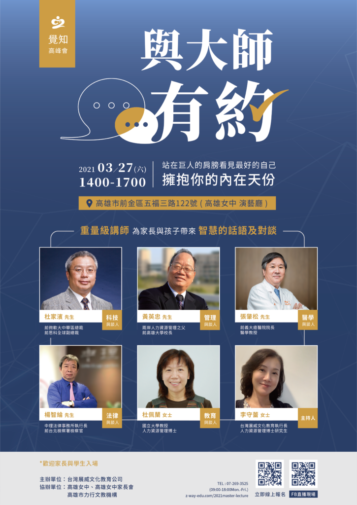 台灣展威覺知高峰會—與大師有約,邀請到跨足產業與學術領域的重量級講師帶來五大主題演講與深度對談,讓準大學生站上巨人的肩膀,擁抱內在天份,看見最好的自己!未來用自己的生命故事影響下一個生命……