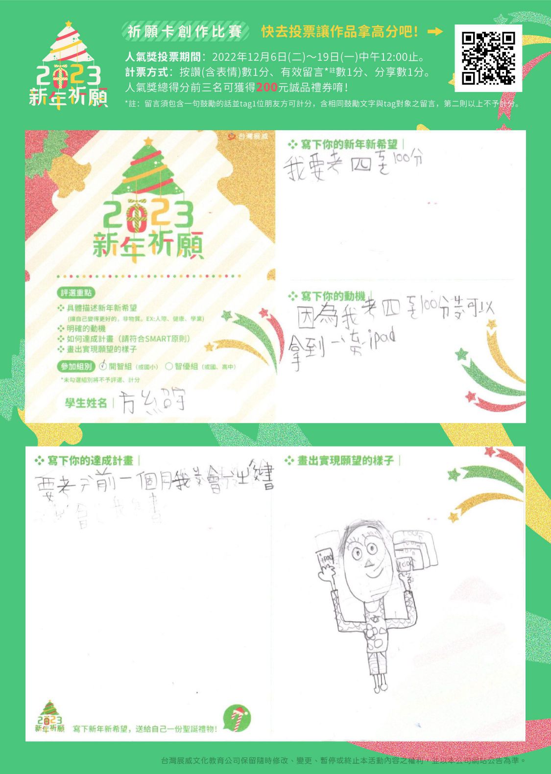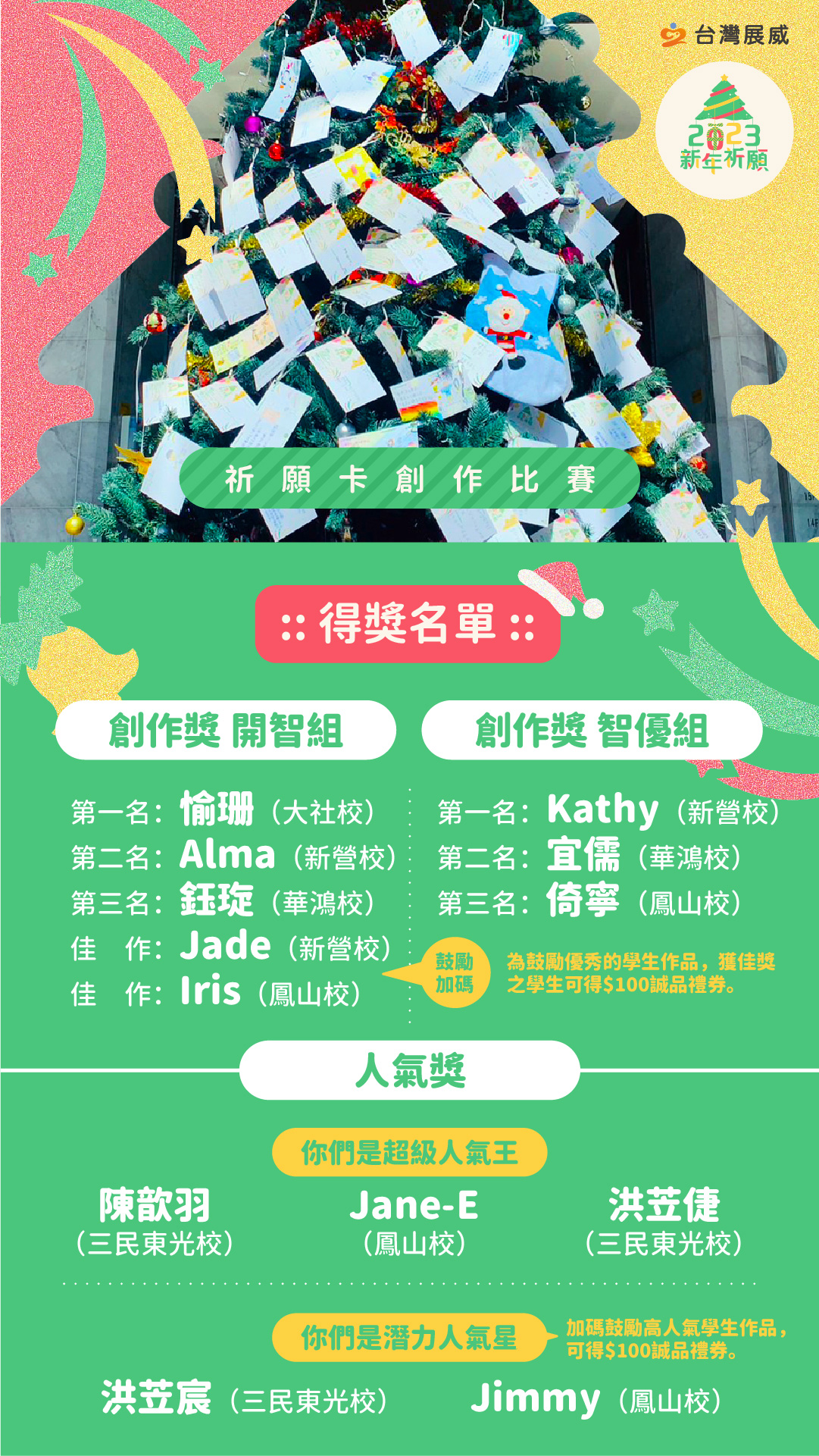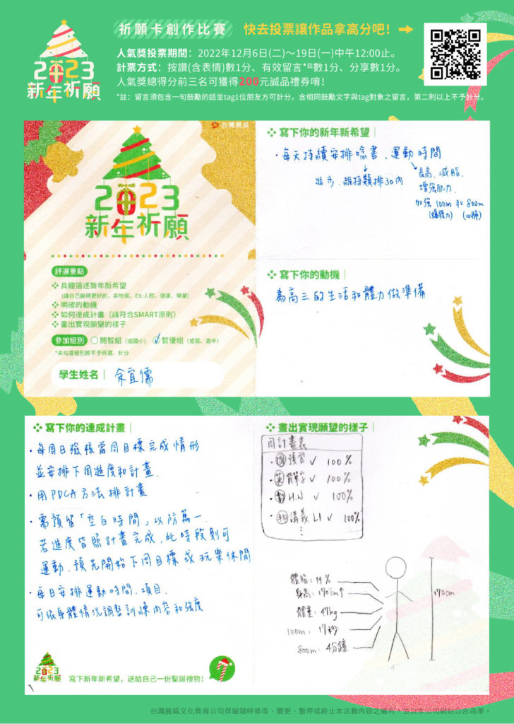「台灣展威文化教育公司」為協助學生將素養力落實於生活中,特別與「覺知素養教育聯盟分校」合辦『2023新年祈願創作比賽』,以培養學生思考力及創作力,並將遴選優秀作品予以鼓勵及表揚。今年,自己去挑想要的聖誕禮物吧!最高可獨得價值 700元 誠品禮卷!