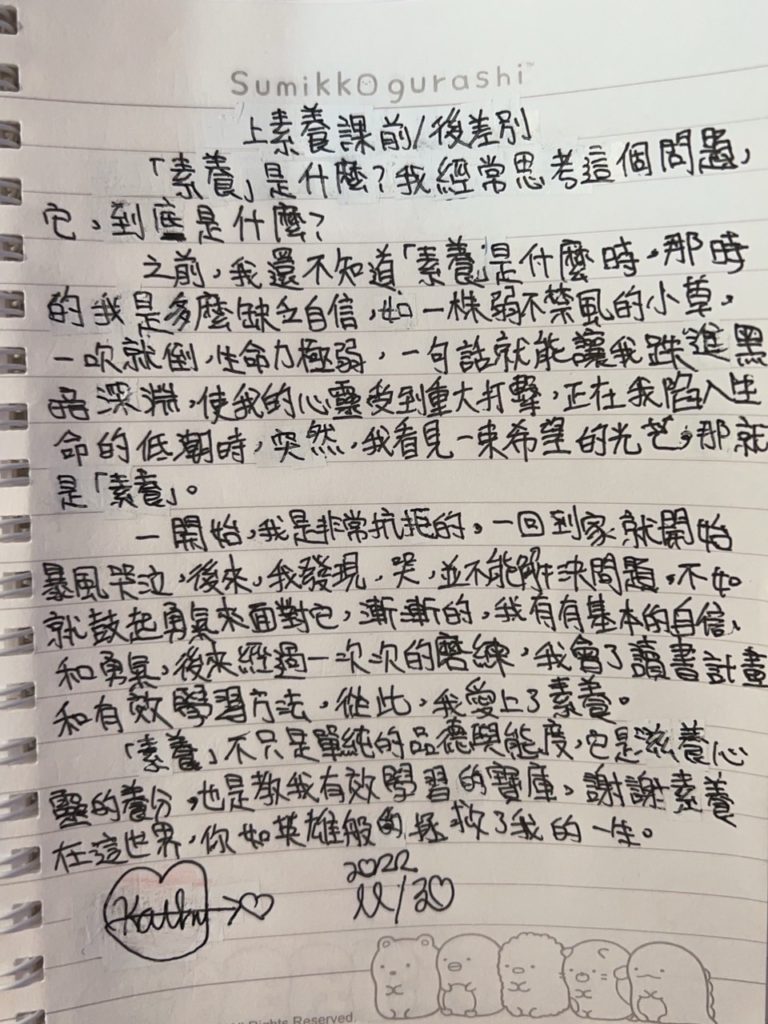 「素養」不只是單純的品德與態度,它是滋養心靈的養分,也是教我有效學習的寶庫,謝謝素養在這世界,你如英雄般的拯救了我的一生。
