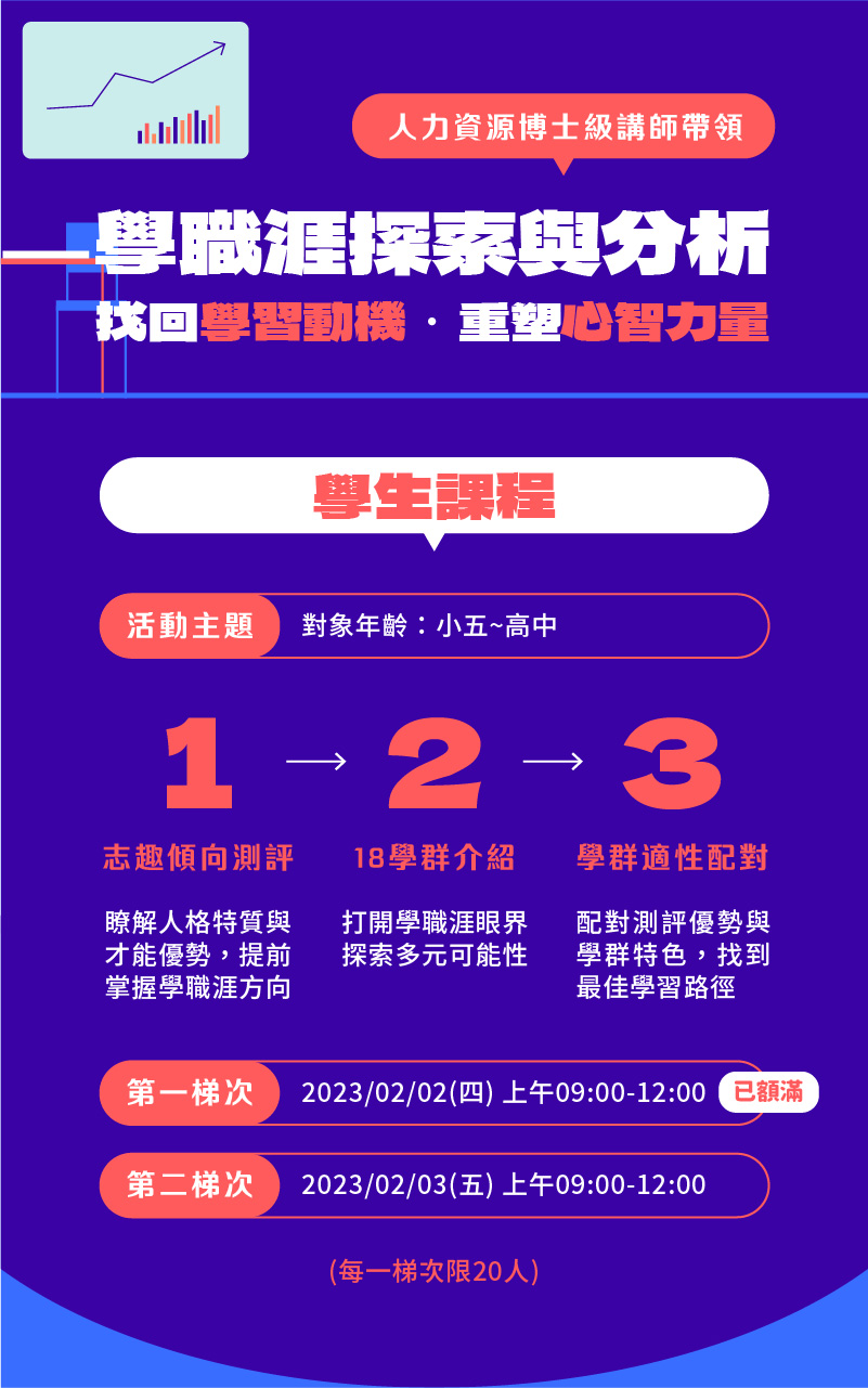 為了讓已進入青少年階段的孩子提前找到志趣傾向,我們特別在寒假舉辦【青少年目標管理工作坊】,由人力資源博士級講師帶領孩子透過【學職涯探索與分析】找到內在學習動機並重塑心智力量。