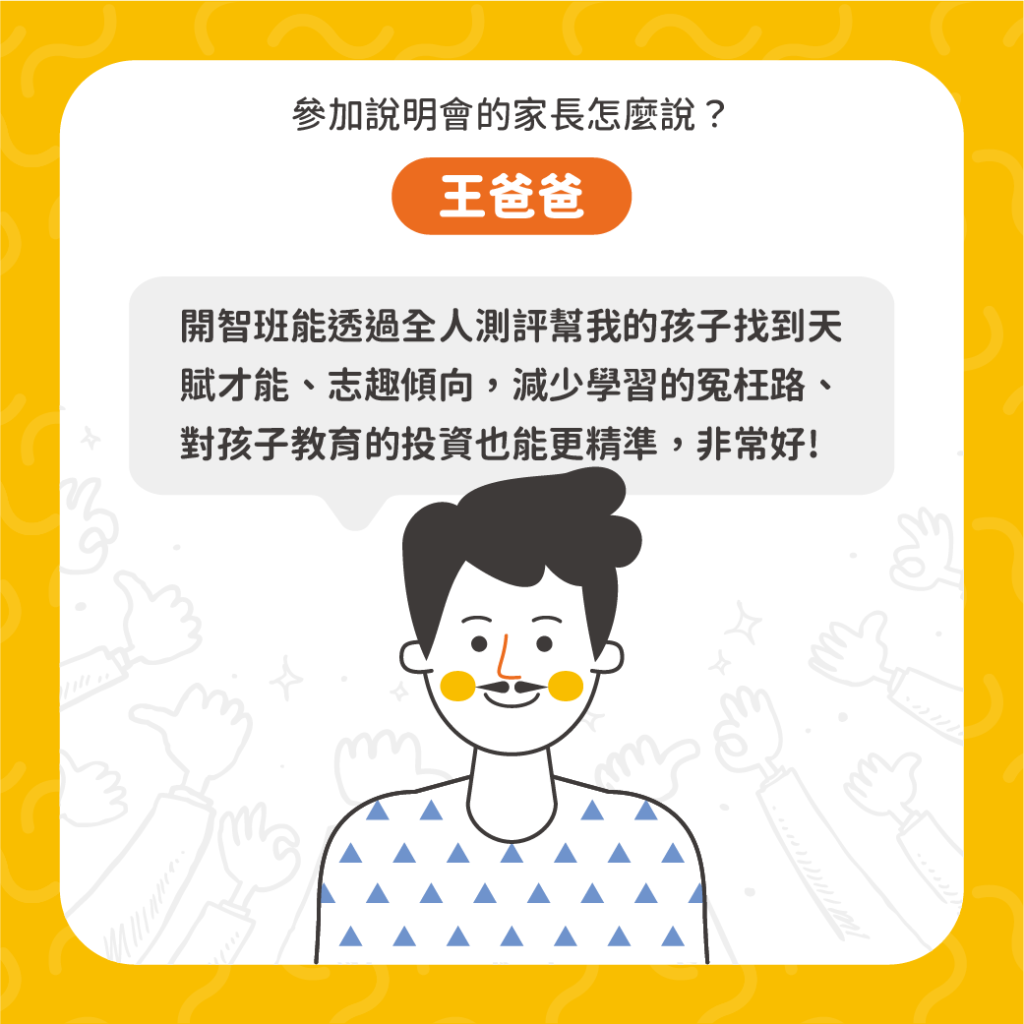 王爸爸:覺知素養國小班能透過全人測評幫我的孩子找到天賦才能、志趣傾向,減少學習的冤枉路、對孩子教育的投資也能更精準,非常好!