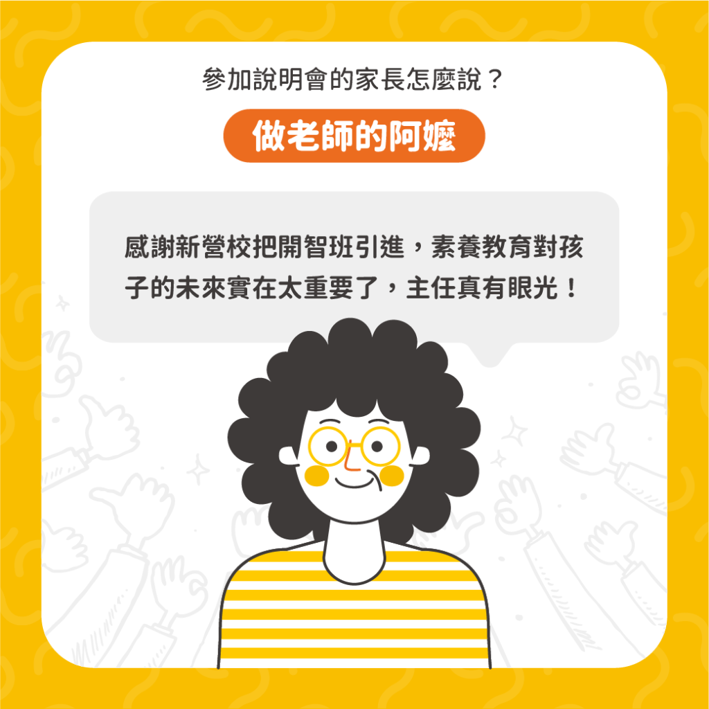 做老師的阿嬤:感謝新營校把覺知素養國小班引進,素養教育對孩子的未來實在太重要了,主任真有眼光!