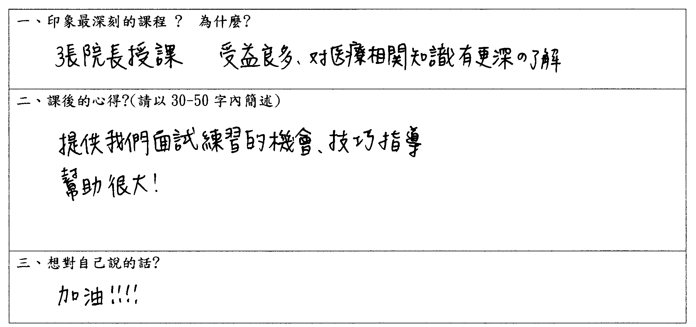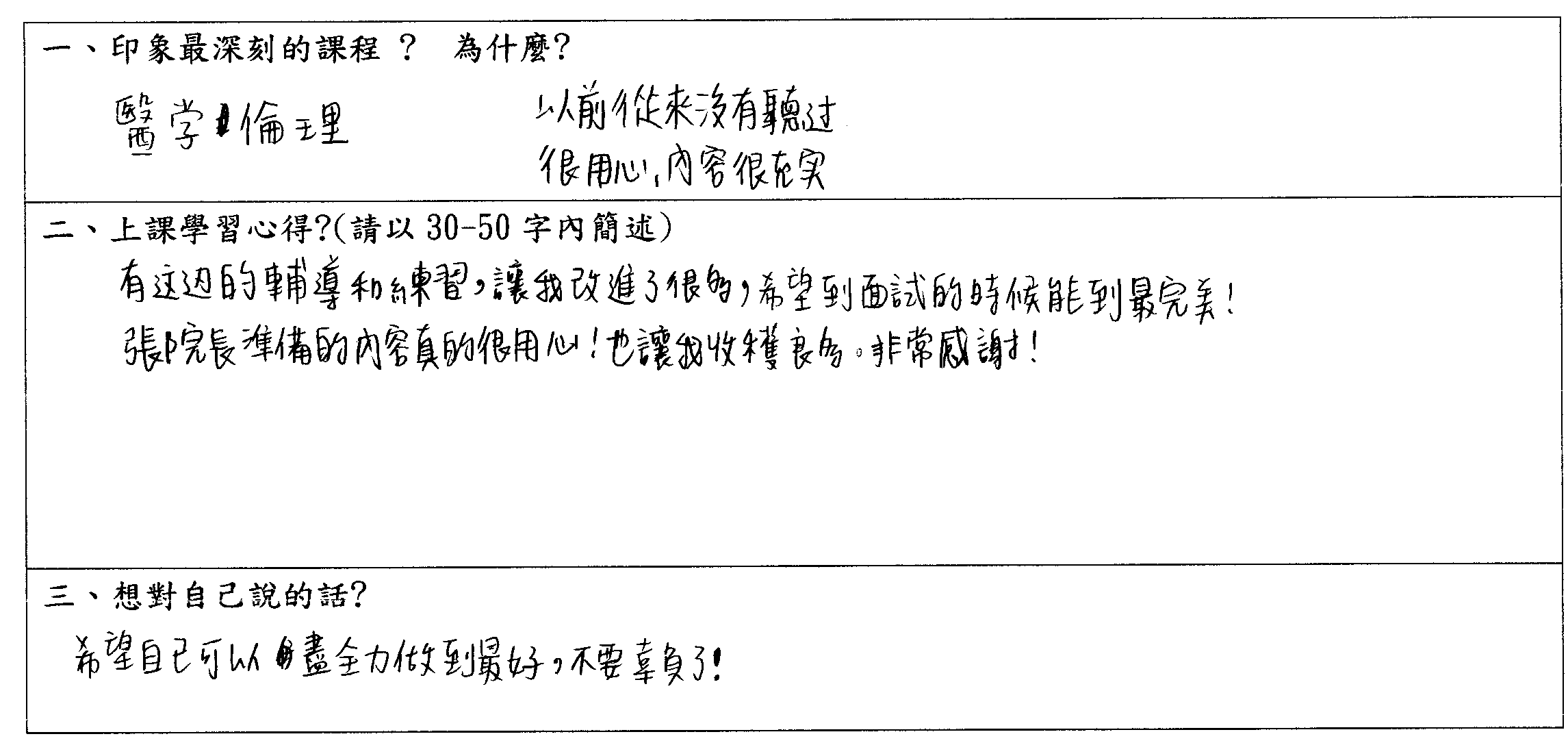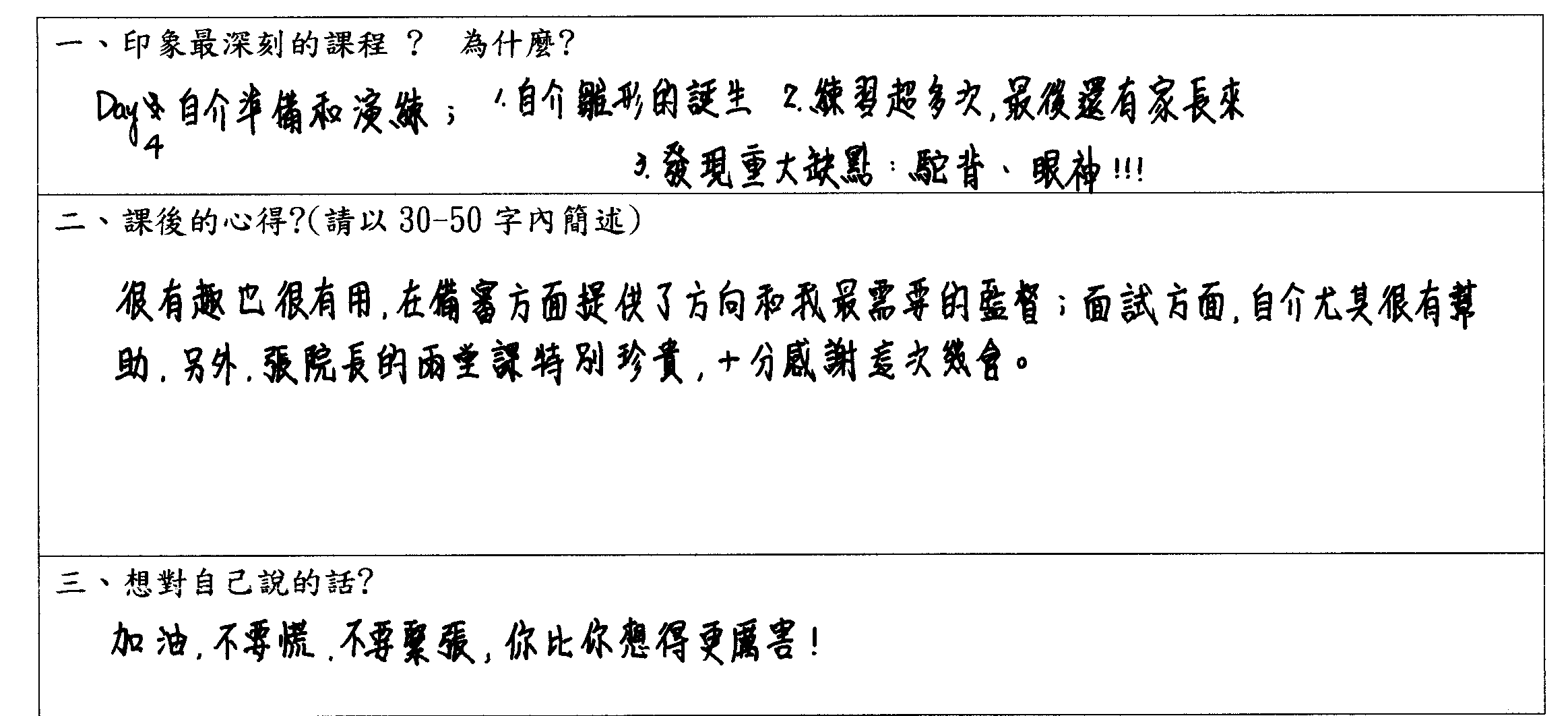 備審面試5日及醫科2日課程皆於4/12(一) 面試實戰 課程結束後劃下句點,豐富的課程內容使同學們印象深刻,並且表示對自己的面試表現信心大增、對未來的人生志向更明確、透過測評了解自己的特質並找到強而有力的報考動機。非常開心各位同學皆有所收穫,台灣展威公司全體同仁也預祝各位同學金榜題名,大家都能進入理想中的學校!