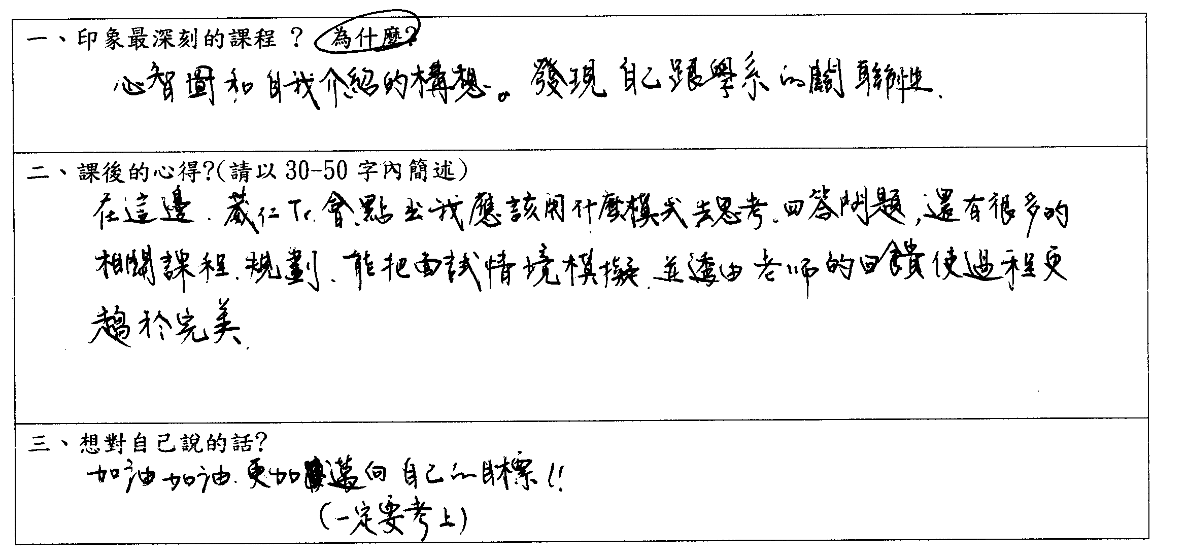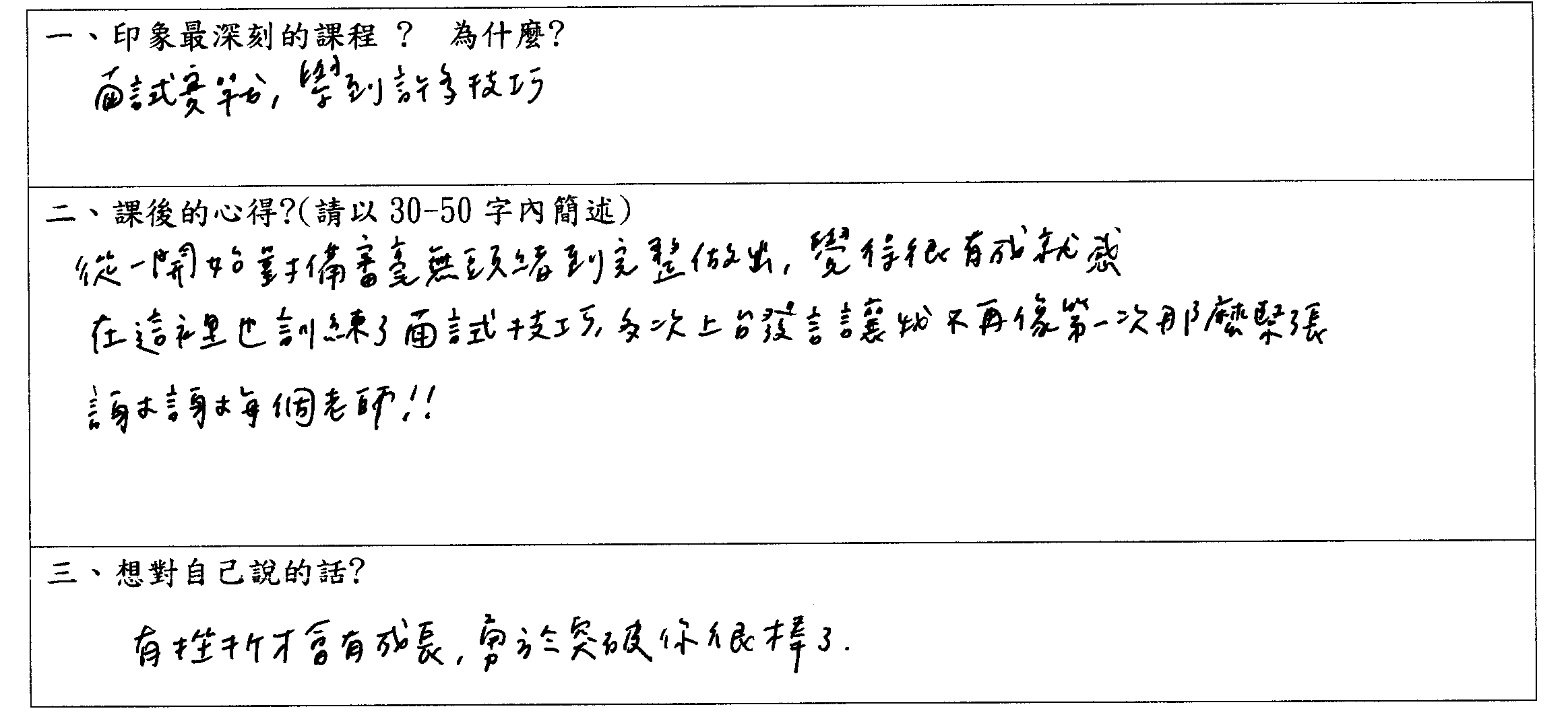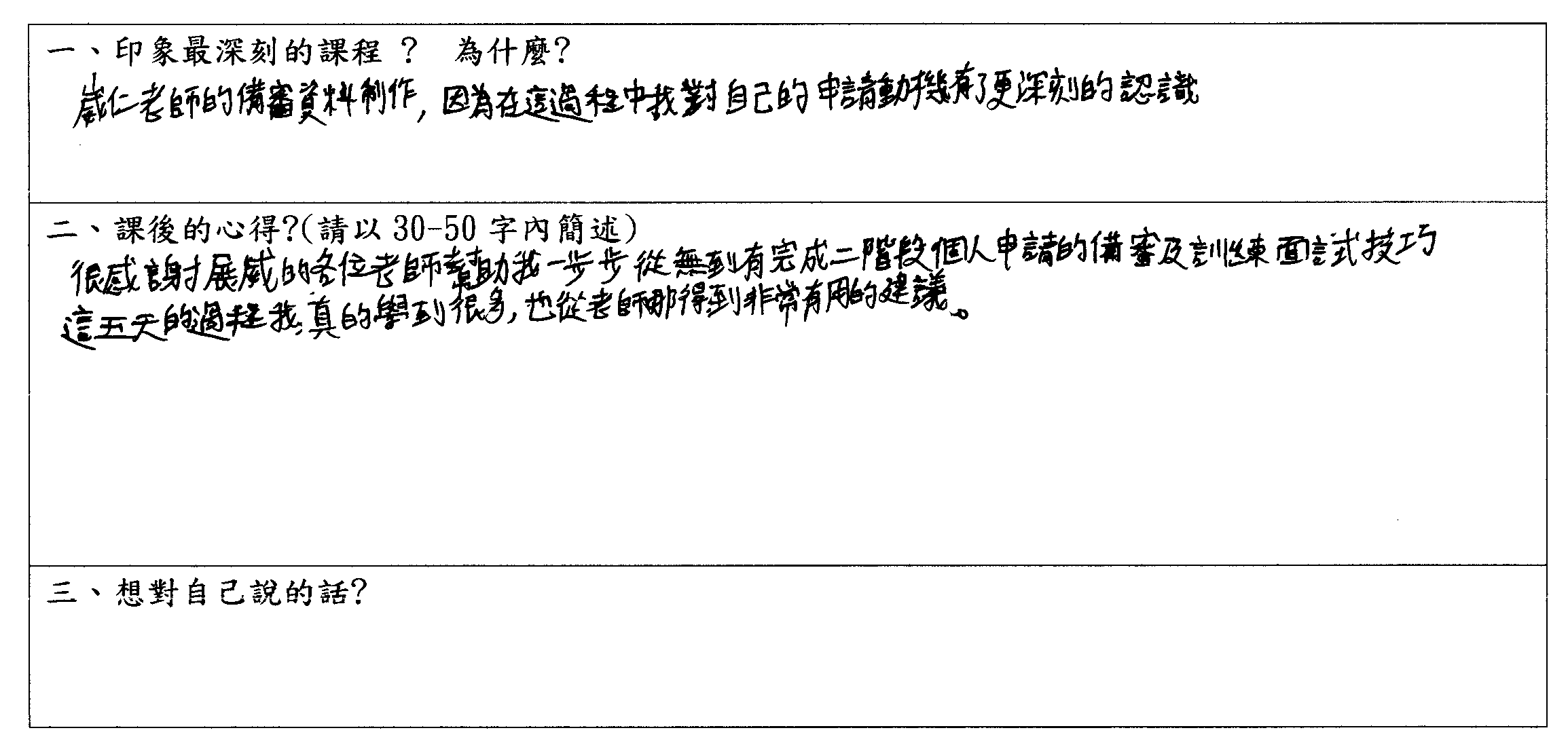 備審面試5日及醫科2日課程皆於4/12(一) 面試實戰 課程結束後劃下句點,豐富的課程內容使同學們印象深刻,並且表示對自己的面試表現信心大增、對未來的人生志向更明確、透過測評了解自己的特質並找到強而有力的報考動機。非常開心各位同學皆有所收穫,台灣展威公司全體同仁也預祝各位同學金榜題名,大家都能進入理想中的學校!